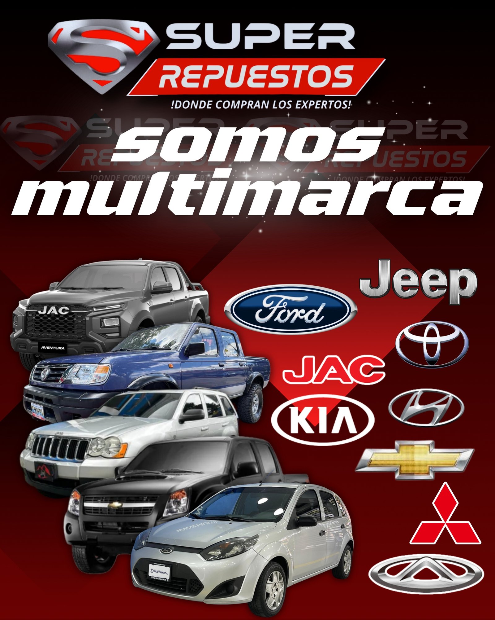 ¡No busques más! Tenemos todo lo que necesitas para el mantenimiento y funcionamiento de tu vehículo. Somos especialistas en Jeep y Ford tambien somos multimarca! En el SUPER multimarcas de Caracas contamos con cualquier tipo de repuesto para tu vehiculo y servicios de taller, ofreciendo la mejor calidad, excelente atención y precios insuperables.